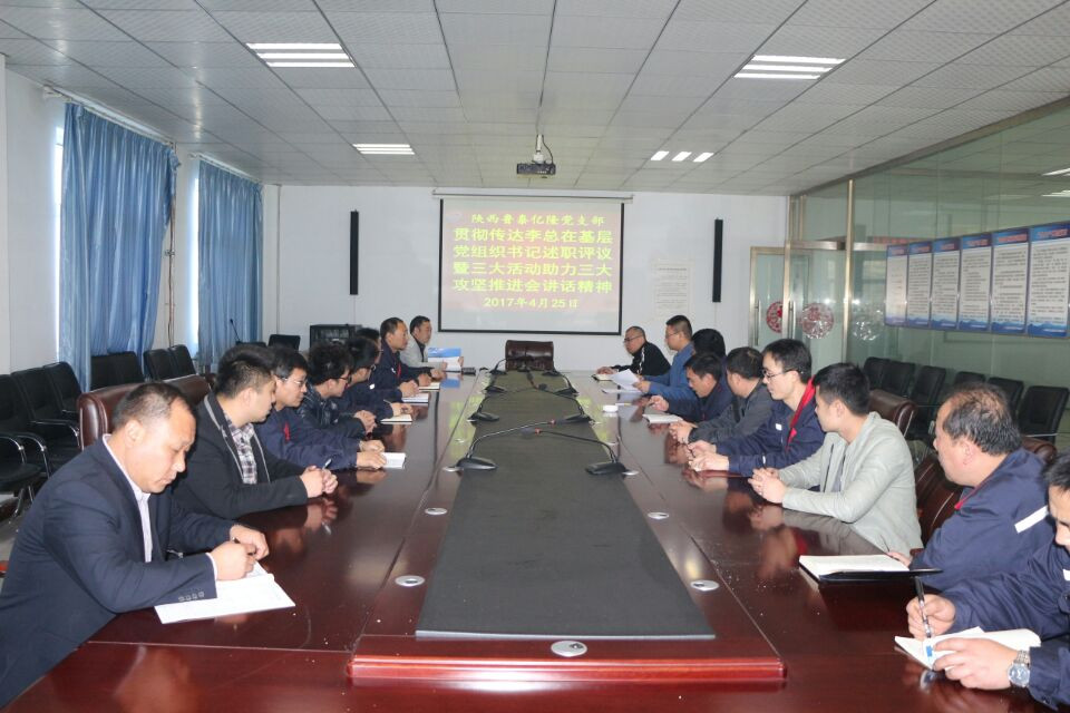 4月25日,陕西B体育(中国)一站式服务平台党总支结合"两学一做"学习教育,组织各党支部认真学习集团公司基层党组织书记述职评议暨"三大活动"、助力"三大攻坚"推进会精神。