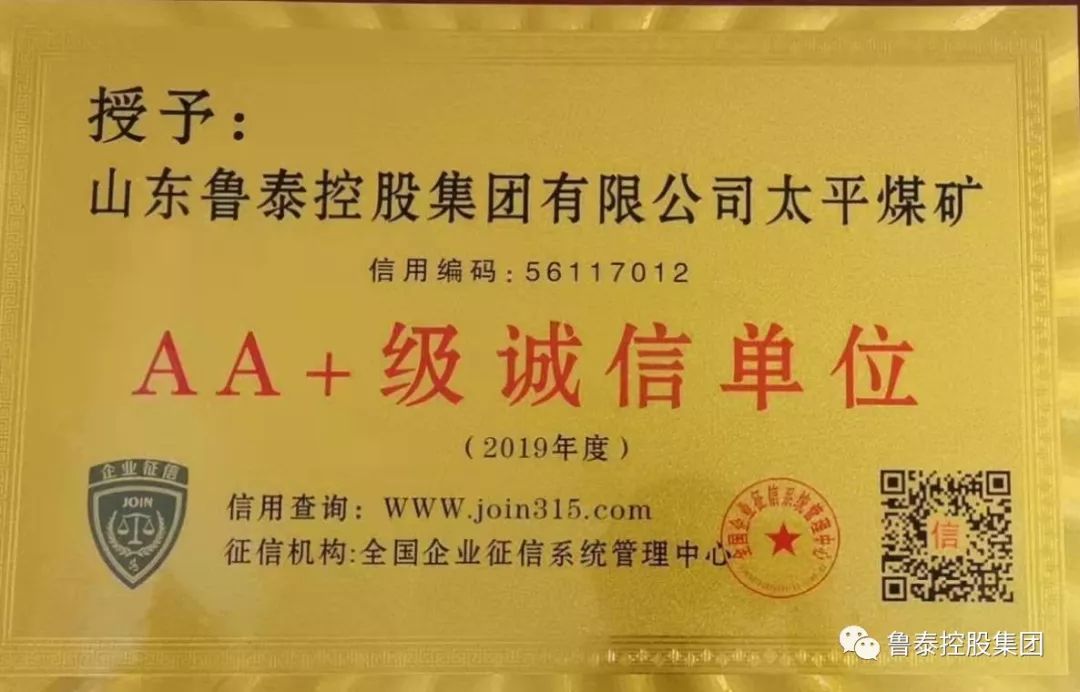 近日,太平煤矿荣获全国B体育平台征信系统管理中心授予的2019年度“AA+级诚信单位”称号。这是继2017、2018年度被评为“立信示范单位”之后荣获的又一殊荣!