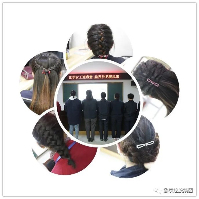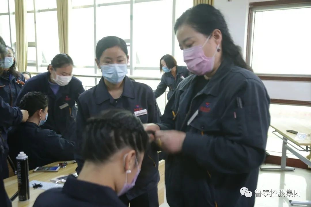 各岗位女工积极参加,老师教得认真,大家学得用心。赵老师分享的第一款发型即为蜈蚣辫编发,创新性地将发尾盘起,点缀漂亮发卡,化学女工们哪怕佩戴安全帽也不会弄乱发型。随后赵老师又手把手分享了鱼骨辫、四股圆辫、西瓜编发、花环盘发等发型,在充分展现化学女工盘发风采的同时又能兼顾各自岗位的安全防护要求。