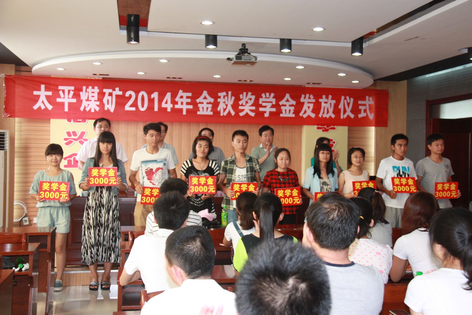 8月28日,太平煤矿2014年度"金秋奖学"金发放仪式在行政办公楼六楼会议室隆重举行。矿纪委书记、工会主席邵作胜主持仪式,矿党委书记汤保民出席仪式并作重要讲话。这标志着该矿2014年度"金秋奖学"活动圆满落幕。此次活动共为2014年考入北京大学、山东大学、西南大学等高校的52名职工子女发放奖学金138000元,为职工子女喜圆大学梦助力,在全矿上下引起强烈反响,受到职工家属普遍好评,擦亮了"金秋奖学"这一工会保障工作的靓品牌,进一步激发了广大职工敬业奉献的积极性,为度危求进传递了正能量。