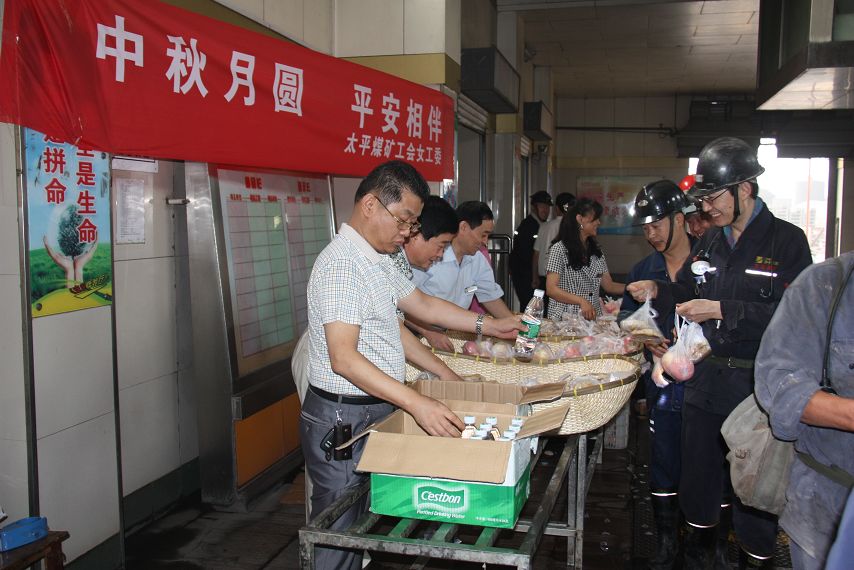 9月8日,正值中秋佳节,太平煤矿工会女工委开展中秋佳节为职工送礼品活动,为节日期间仍坚守岗位的工友们送去了一份节日的祝福。矿党委书记汤保民、纪委书记兼工会主席邵作胜、后勤副矿长荆明光同志亲临活动现场,他们和女工协管员一同将象征团圆的月饼和寓意平安的苹果以及香喷喷的油饼、清凉的矿泉水亲手送到一线职工手中,祝他们节日快乐并叮嘱他们时刻注意安全生产,带去了组织的温暖与关爱。